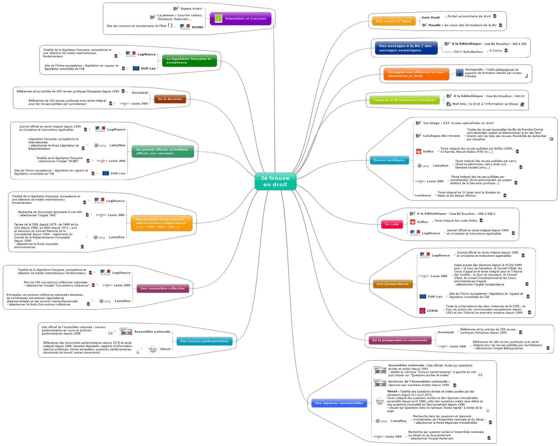 Des cours en ligne Univ-Droit http://www.univ-droit.fr/ http://moodle.univ-fcomte.fr/login/index.php Des ouvrages à la BU / des ouvrages numériques A la bibliothèque - cote BU Proudhon : 340 à 348 ScholarVox http://univ.scholarvox.com.scd1.univ-fcomte.fr/ Décrypter une référence ou une abréviation en droit http://jurisguide.univ-paris1.fr/ Lexiques et dictionnaires juridiques A la bibliothèque - Cote BU Proudhon : 340.03 http://www.net-iris.fr/lexique-juridique/ Revues juridiques 1er étage : 127 revues spécialisées en droit Catalogue des revues http://web.a.ebscohost.com/pfi/search/basic?sid=5cb175e1-16cf-4954-b834-cc06adccd48a@sessionmgr4006&vid=0&sdb=edspub&tid=3000EP Dalloz http://scd1.univ-fcomte.fr/login?url=http://www.dalloz.fr Lamyline http://scd1.univ-fcomte.fr/login?url=http://lamyline.lamy.fr/Content/Inicio.aspx?DATA=tlxYZWJzrprx;t2w7ANKY Lexis 360 http://scd1.univ-fcomte.fr/login?url=http://www.lexis360.fr/Home.aspx Lextenso http://scd1.univ-fcomte.fr/login?url=http://www.lextenso.fr/ip Un code A la bibliothèque - Cote BU Proudhon : 348.2-348.3 Dalloz http://scd1.univ-fcomte.fr/login?url=http://www.dalloz.fr Legifrance http://www.legifrance.gouv.fr/ Une jurisprudence Legifrance http://www.legifrance.gouv.fr/ Lexis 360 http://scd1.univ-fcomte.fr/login?url=http://www.lexis360.fr/Home.aspx EUR-Lex http://eur-lex.europa.eu/fr/index.htm CURIA http://curia.europa.eu/jcms/jcms/j_6/accueil De la jurisprudence commentée Doctrinal http://scd1.univ-fcomte.fr/login?url=http://ip.doctrinalplus.fr/ Lexis 360 http://scd1.univ-fcomte.fr/login?url=http://www.lexis360.fr/Home.aspx Des réponses ministérielles http://www.assemblee-nationale.fr/ http://archives.assemblee-nationale.fr/ http://www.senat.fr/ Lamyline http://scd1.univ-fcomte.fr/login?url=http://lamyline.lamy.fr/Content/Inicio.aspx?DATA=tlxYZWJzrprx;t2w7ANKY Lexis 360 http://scd1.univ-fcomte.fr/login?url=http://www.lexis360.fr/Home.aspx Des travaux parlementaires Assemblée nationale http://www.assemblee-nationale.fr/ Sénat http://www.senat.fr/ Une convention collective Legifrance http://www.legifrance.gouv.fr/ Lexis 360 http://scd1.univ-fcomte.fr/login?url=http://www.lexis360.fr/Home.aspx Lamyline http://scd1.univ-fcomte.fr/login?url=http://lamyline.lamy.fr/Content/Inicio.aspx?DATA=tlxYZWJzrprx;t2w7ANKY Une décision d'une autorité administrative indépendante ( ex. : AMF, CNIL, CSA...) Legifrance http://www.legifrance.gouv.fr/ Lexis 360 http://scd1.univ-fcomte.fr/login?url=http://www.lexis360.fr/Home.aspx Lamyline http://scd1.univ-fcomte.fr/login?url=http://lamyline.lamy.fr/Content/Inicio.aspx?DATA=tlxYZWJzrprx;t2w7ANKY Un journal officiel, un bulletin officiel, une circulaire Legifrance http://www.legifrance.gouv.fr/ Lamyline http://scd1.univ-fcomte.fr/login?url=http://lamyline.lamy.fr/Content/Inicio.aspx?DATA=tlxYZWJzrprx;t2w7ANKY Lexis 360 http://scd1.univ-fcomte.fr/login?url=http://www.lexis360.fr/Home.aspx EUR-Lex http://eur-lex.europa.eu/fr/index.htm De la doctrine Doctrinal http://scd1.univ-fcomte.fr/login?url=http://ip.doctrinalplus.fr/ Lexis 360 http://scd1.univ-fcomte.fr/login?url=http://www.lexis360.fr/Home.aspx La législation française et européenne Legifrance http://www.legifrance.gouv.fr/ EUR-Lex http://eur-lex.europa.eu/fr/index.htm Orientation et Concours Espace Avenir La presse : Courrier cadres, l'Etudiant, Rebondir... SCORE http://www.fonction-publique.gouv.fr/score