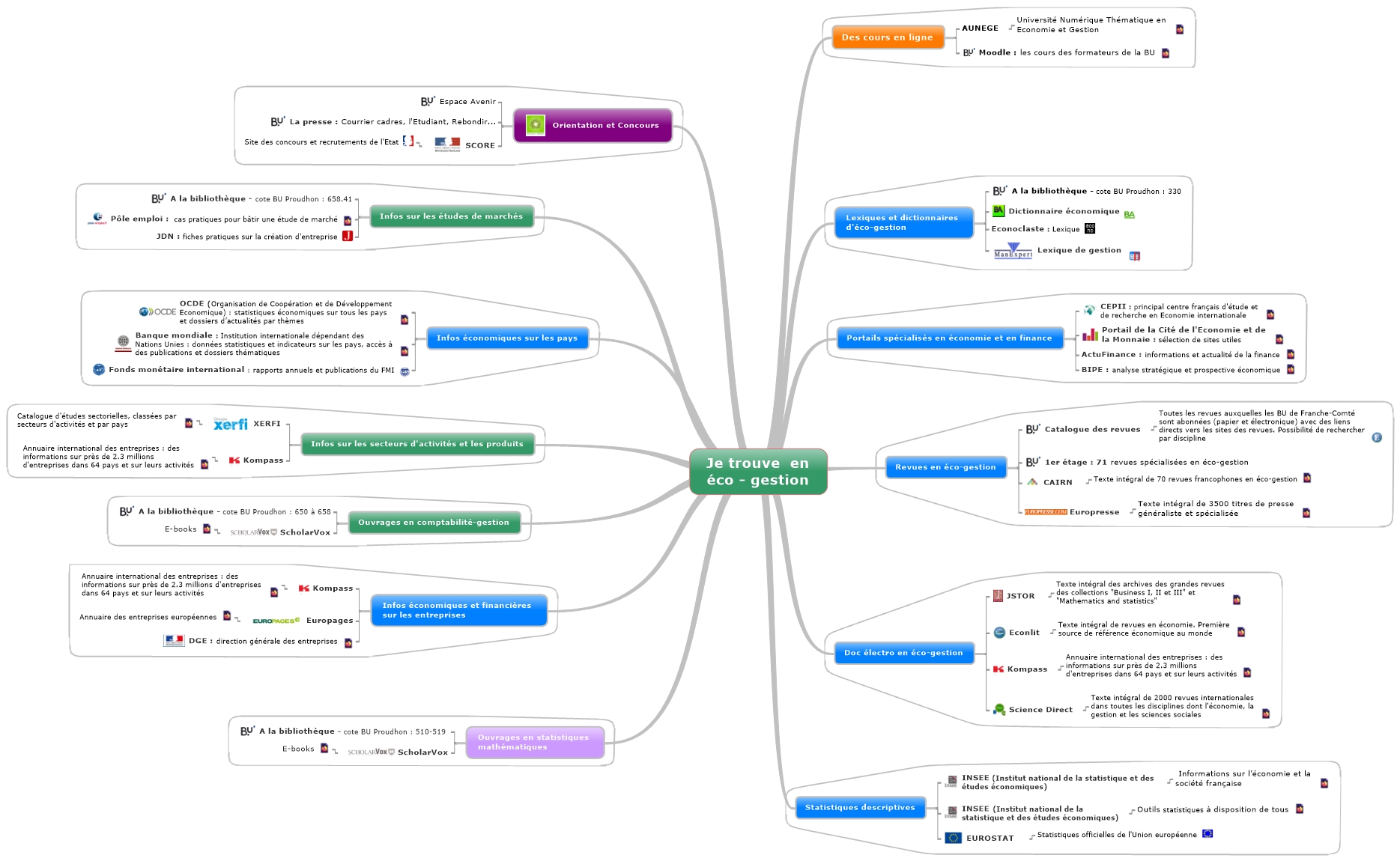 Des cours en ligne AUNEGE http://www.aunege.org/ http://moodle.univ-fcomte.fr/login/index.php Lexiques et dictionnaires d'éco-gestion A la bibliothèque - cote BU Proudhon : 330 http://www.banque-et-assurance.com/dictionnaire/ http://econoclaste.org.free.fr/econoclaste/?page_id=26 http://www.manexpert.com/fr/docs\lexique_bibliographie\LEXIQUE.pdf Portails spécialisés en économie et en finance http://www.cepii.fr/ http://www.citedeleconomie.fr/-Le-portail- http://www.actufinance.fr/ http://www.bipe.com/ Revues en éco-gestion Catalogue des revues http://web.a.ebscohost.com/pfi/search/basic?sid=5cb175e1-16cf-4954-b834-cc06adccd48a@sessionmgr4006&vid=0&sdb=edspub&tid=3000EP 1er étage : 71 revues spécialisées en éco-gestion CAIRN http://scd1.univ-fcomte.fr/login?url=http://www.cairn.info Europresse https://nouveau-europresse-com.scd1.univ-fcomte.fr/Search/Reading Doc électro en éco-gestion JSTOR http://scd1.univ-fcomte.fr/login?url=http://www.jstor.org Econlit http://scd1.univ-fcomte.fr/login?url=http://search.ebscohost.com/login.aspx?authtype=ip,uid&profile=ehost&defaultdb=ecn Kompass http://scd1.univ-fcomte.fr/login?url=http://fr.kompass.com/ebol/ip Science Direct http://scd1.univ-fcomte.fr/login?url=http://www.sciencedirect.com/ Statistiques descriptives INSEE (Institut national de la statistique et des études économiques)   http://www.insee.fr/fr/methodes/default.asp?page=outils/liste-outils.htm INSEE (Institut national de la statistique et des études économiques) https://www.insee.fr/fr/information/2021908 EUROSTAT  https://ec.europa.eu/eurostat/fr/home Ouvrages en statistiques mathématiques A la bibliothèque - cote BU Proudhon : 510-519 ScholarVox http://univ.scholarvox.com.scd1.univ-fcomte.fr/ Infos économiques et financières sur les entreprises Kompass http://scd1.univ-fcomte.fr/login?url=http://fr.kompass.com/ebol/ip Europages http://www.europages.fr/ http://www.entreprises.gouv.fr/dge Ouvrages en comptabilité-gestion A la bibliothèque - cote BU Proudhon : 650 à 658 ScholarVox http://univ.scholarvox.com.scd1.univ-fcomte.fr/ Infos sur les secteurs d'activités et les produits  XERFI http://www.xerfi.fr/ Kompass http://scd1.univ-fcomte.fr/login?url=http://fr.kompass.com/ebol/ip Infos économiques sur les pays http://www.oecd.org/fr/ http://www.banquemondiale.org/ http://www.imf.org/external/french/index.htm Infos sur les études de marchés A la bibliothèque - cote BU Proudhon : 658.41 http://www.pole-emploi.fr/actualites/etape-4-batissez-une-etude-de-marche-@/suarticle.jspz?id=92508 http://www.journaldunet.com/management/pratique/creation-d-entreprise/905/faire-une-etude-de-marche.html Orientation et Concours Espace Avenir La presse : Courrier cadres, l'Etudiant, Rebondir... SCORE http://www.fonction-publique.gouv.fr/score