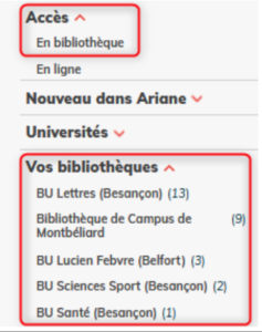 Utilisez les filtres à gauche des résultats : « Accès / En bibliothèque » ou la BU de votre choix dans le filtre « Vos bibliothèques ».